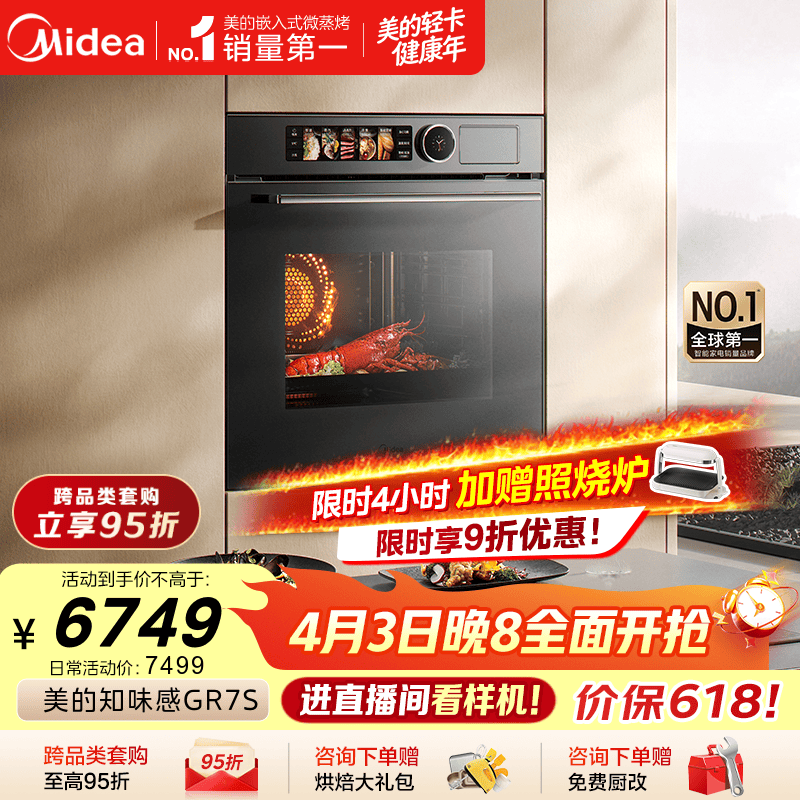 美的(Midea)【0.2s极速升温】嵌入式微蒸烤炸炖一体机GR7S 温湿智控空气炸 烤贝果 78L蒸烤箱 美的知味感R7S