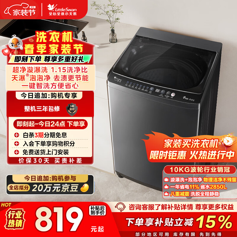 小天鹅(LittleSwan)波轮洗衣机小型全自动家用 10KG TB10V27T 以旧换新 国家补贴 京东自营 一级能效 宿舍租房神器