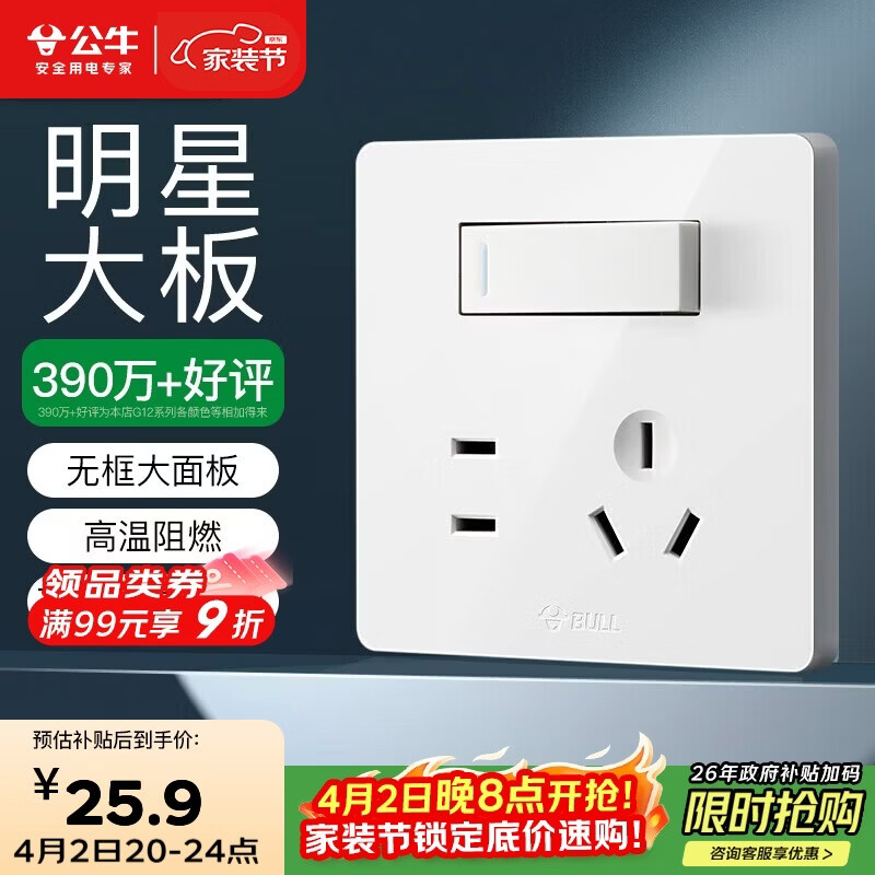 公牛(BULL)开关插座 G12系列一开双控五孔带开关插座86型面板G12E334S象牙白