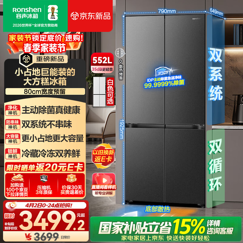 容声526进阶款 大方糕552L十字门冰箱大容量双系统超薄嵌入家用一级能效灰BCD-552Q30CQLBD国家补贴