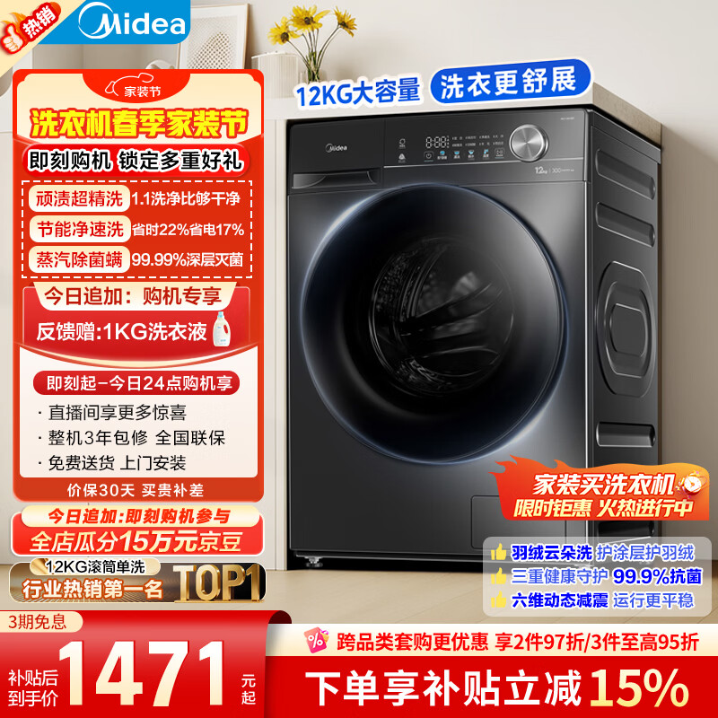 美的(Midea)简尚 滚筒洗衣机全自动 12公斤大容量 1.1高洗净比 除菌净螨 超薄 MG120V36T 以旧换新 补贴
