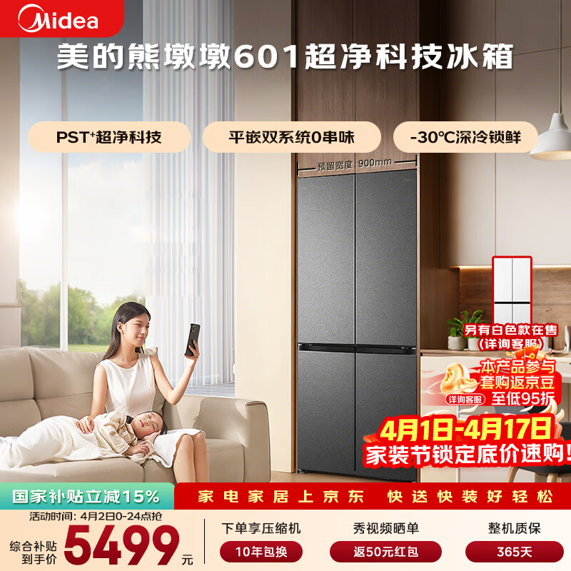 美的(Midea)熊墩墩601L十字门冰箱超薄零嵌入式双系统净味超大容量一级能效以旧换新BCD-601WUSPZM(E)海贝黛