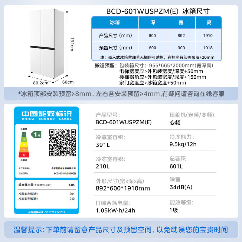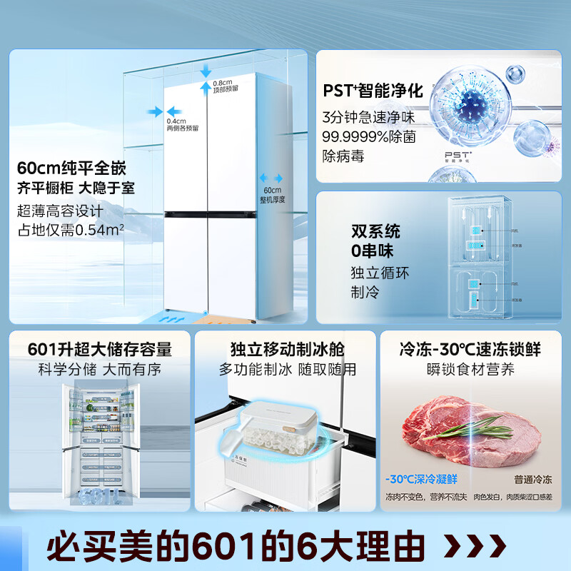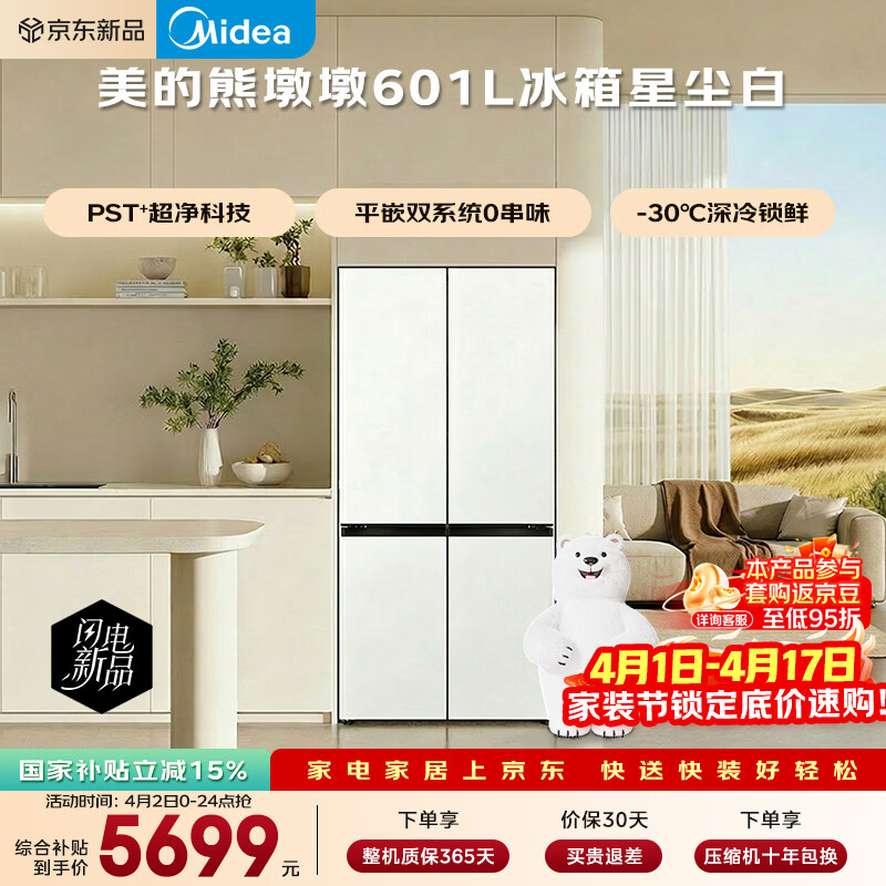 美的(Midea)熊墩墩601L十字门冰箱超薄零嵌入式双系统净味超大容量一级能效以旧换新BCD-601WUSPZM(E)星尘白