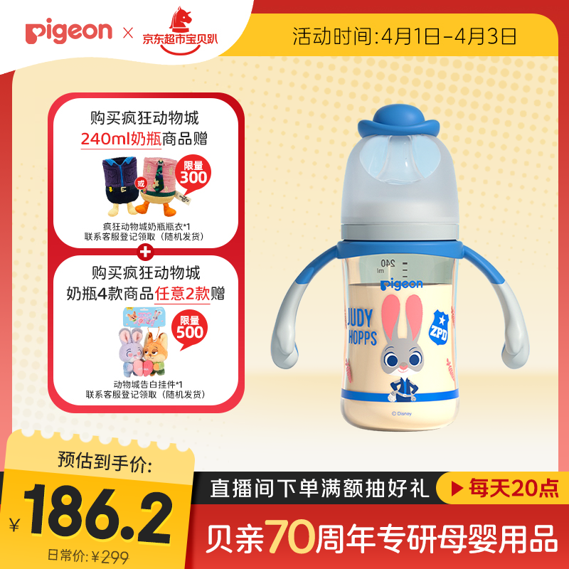 贝亲(Pigeon)迪士尼宽口径PPSU双把手彩绘奶瓶240mL M号 3月+ 萌警朱迪 AA272