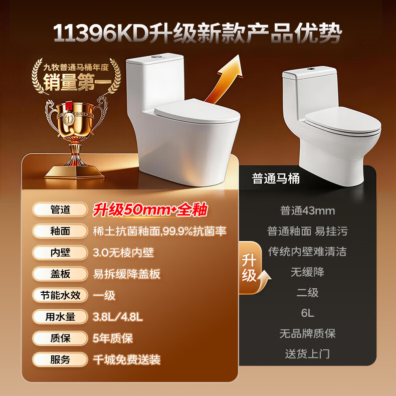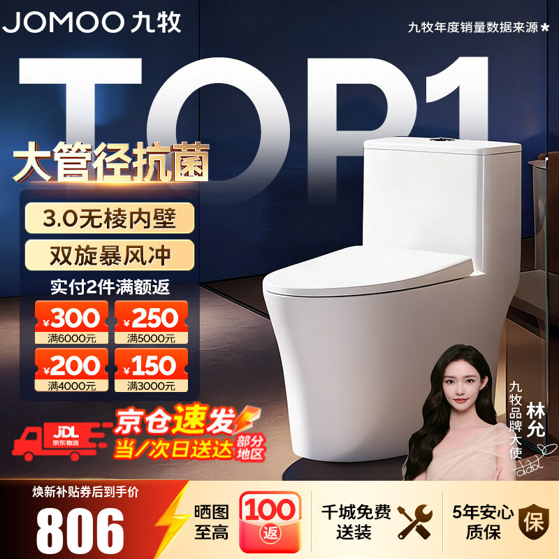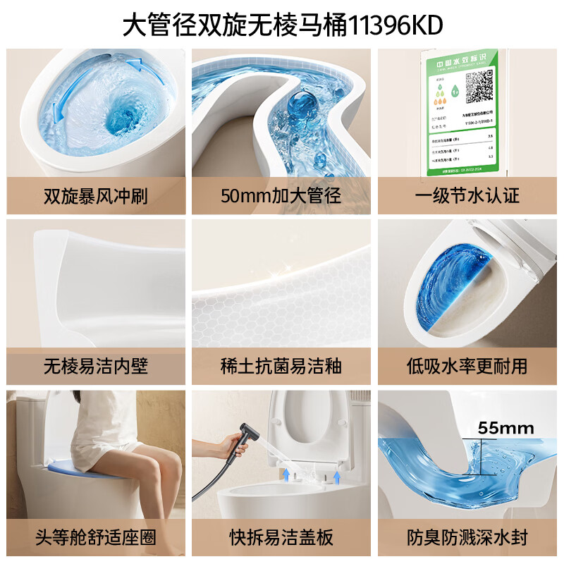 九牧(JOMOO)马桶 家用虹吸式马桶大冲力节水坐便器 防臭瞬冲 易洁抗菌马桶 升级大管径-易洁无棱11396-305坑