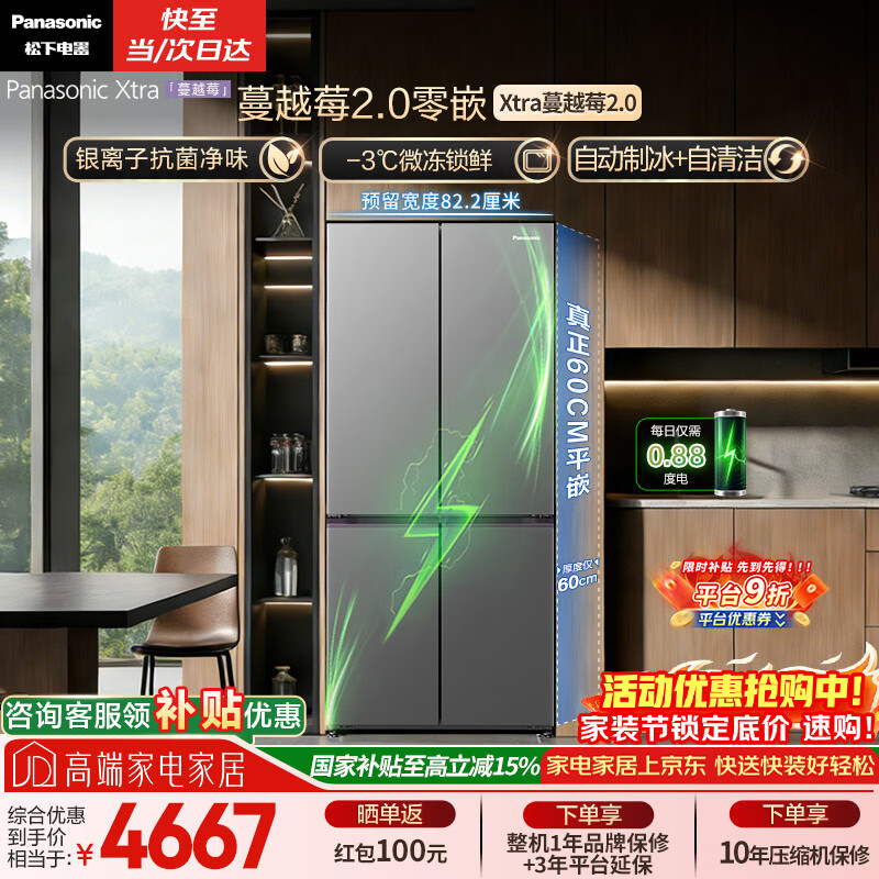 松下(Panasonic)Xtra蔓越莓2.0十字门500L冰箱四开门家用超薄零嵌入自动制冰一级能效NR-XD50C5B-H【国家补贴】