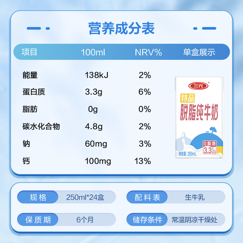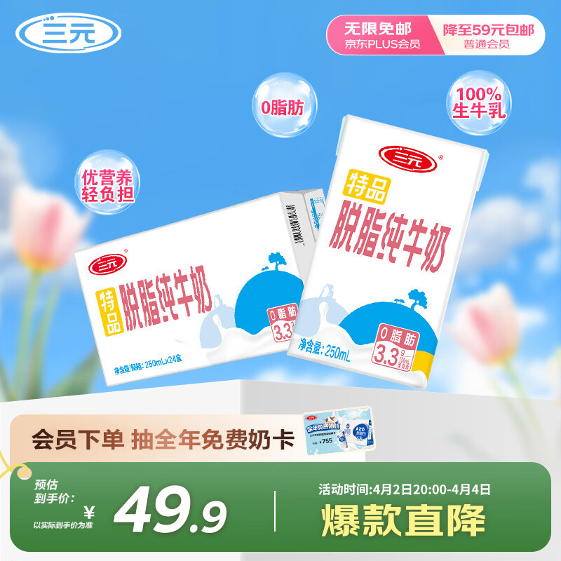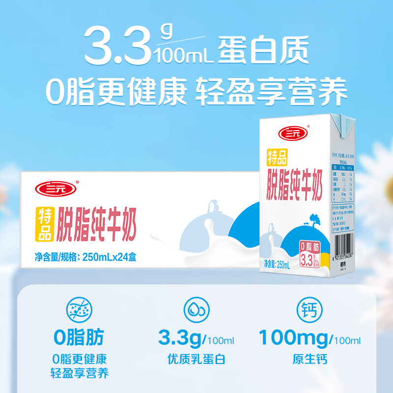 三元特品脱脂纯牛奶整箱250ml*24盒 0脂肪 健身搭档 整箱送礼
