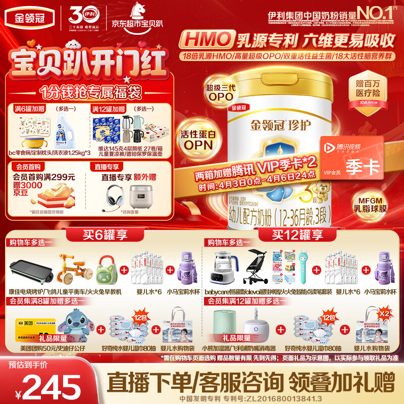 伊利金领冠珍护幼儿A2β-酪蛋白奶粉3段12-36月900g*1罐 HMO乳源专利