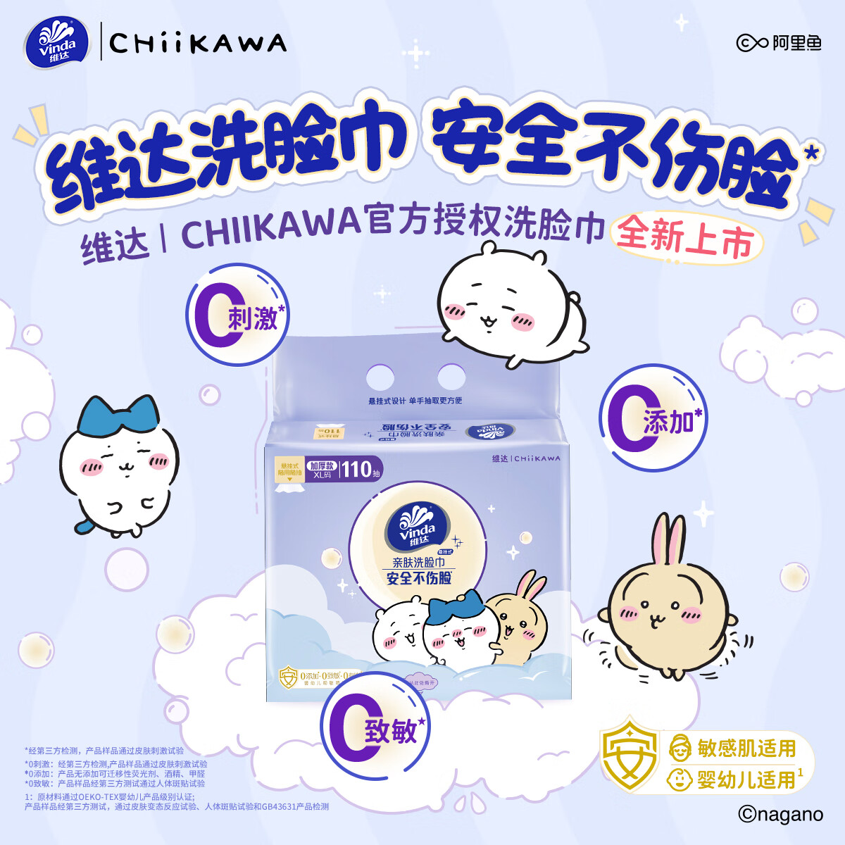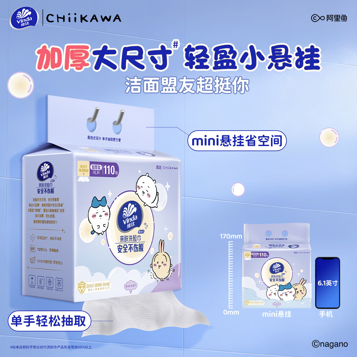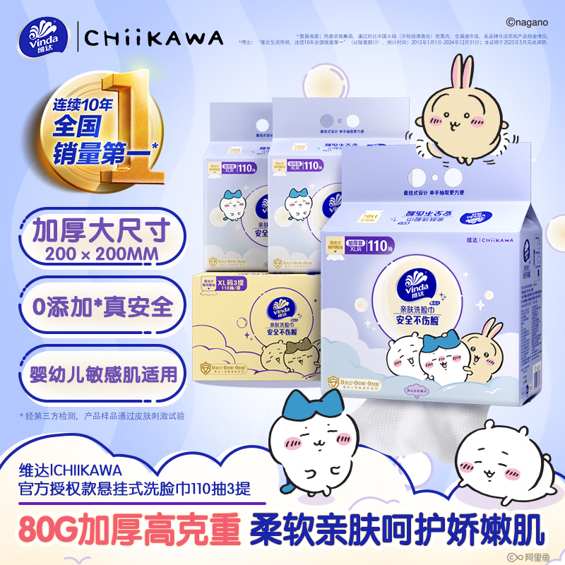 维达(Vinda)维达|CHIIKAWA 洗脸巾110抽*3提80g高克重XL码 一次性擦脸巾